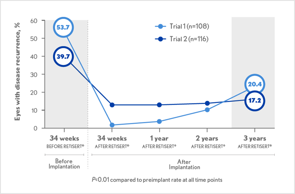 Uveitis recurrence rates dropped from 53.7% to 1.8% (Trial 1) and from 39.7% to 12.9% (Trial 2) 34 weeks post implantation, and control was maintained through 3 years of treatment with RETISERT®¹